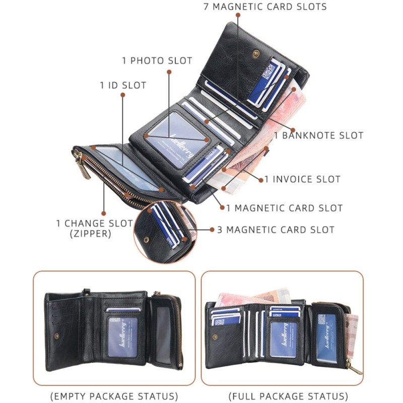 The BAELLERRY wallet is a fashionable and stylish accessory for men. The wallet is made of high-quality polyurethane (PU) leather, which is known for its durability, water resistance, and softness. The wallet originates from China and is designed to be short in length, with a height of 3cm, a width of 10cm, and a length of 12cm, making it compact and easy to carry.  The wallet has a solid pattern type and features two unique decorations, chains, and sequins, giving it a stylish and fashionable appearance. The chains and sequins give the wallet a touch of elegance and sophistication, making it an excellent accessory for any occasion.  The wallet features multiple compartments that are designed to help you organize your items efficiently. The compartments include an interior slot pocket, an interior zipper pocket, an interior key chain holder, an interior compartment, a zipper pouch, a coin pocket, a note compartment, a photo holder, and a card holder. These compartments provide ample space for you to store your cash, cards, coins, and other valuables.  The lining of the wallet is made of high-quality polyester material, which is known for its strength and durability. The wallet's material composition is 100% PU leather, making it a cruelty-free and vegan-friendly product.  The wallet has a zipper and hasp closure, which provides secure storage for your items. This closure ensures that your items are safe and secure and prevents them from falling out of the wallet.  Overall, the BAELLERRY wallet is a functional and fashionable accessory that is perfect for men who value organization and style. Its high-quality materials, multiple compartments, and unique decorations make it an excellent choice for everyday use or special occasions.